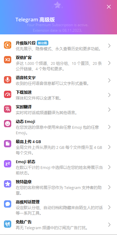首先telegram premium会员是telegram 官方2022年推出的会员服务,开通了会员就可以额外解锁一些功能。比如每个文档的上传大小增加 4GB、免除大部分广告、可以设置个性化的图标和签名等等。